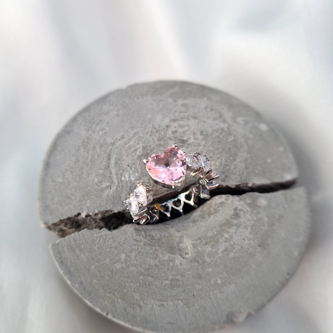 • Ανοιγόμενο δαχτυλίδι σε ασημί χρώμα , με λευκές κρυστάλλινες καρδιές περιμετρικά και στη μέση μια ελαφρώς μεγαλύτερη σε ροζ χρώμα.