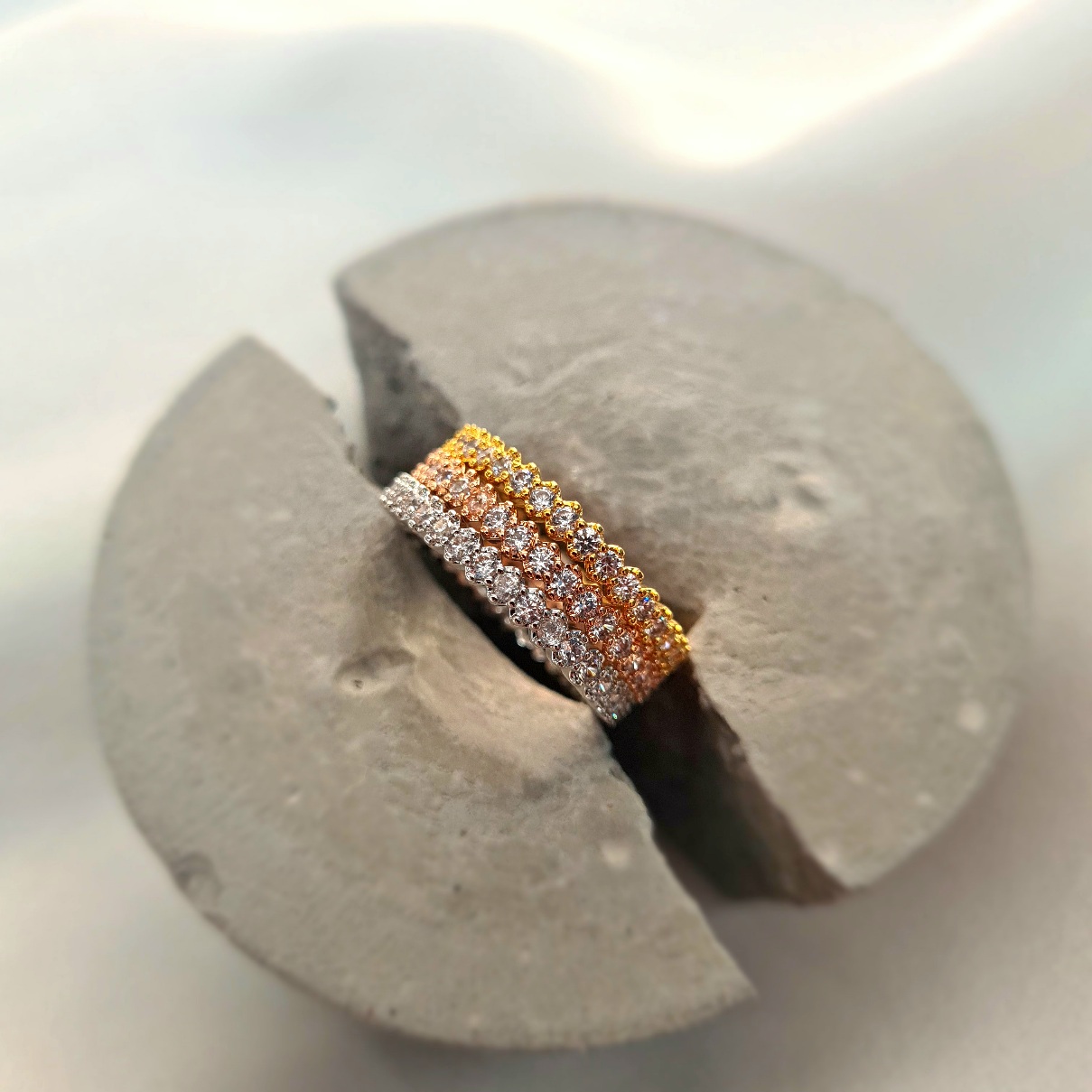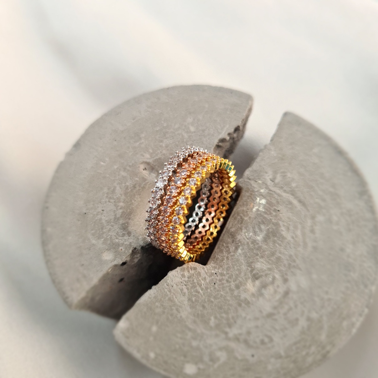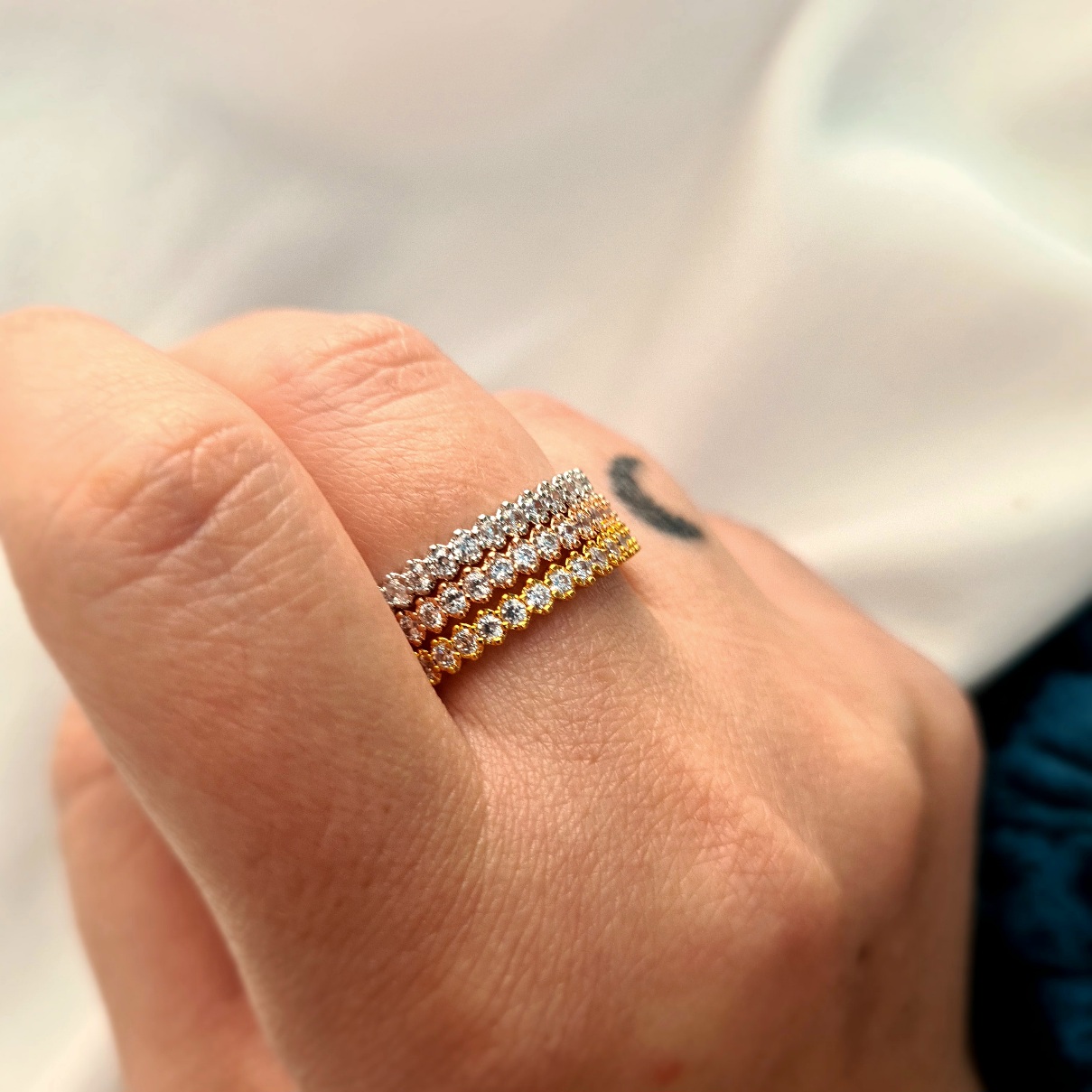 • Σετ από λεπτά βεράκια σε τρία χρώματα (ένα ροζ χρυσό, ένα ασημί και ένα χρυσό) με λευκά ζιργκόν περιμέτρικά.