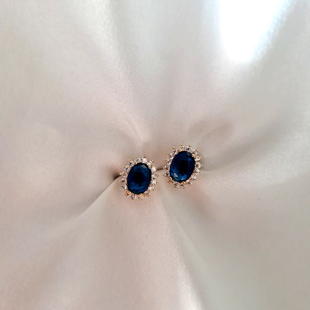 • Καρφωτά σκουλαρίκια ροζέτα με μπλέ σκούρο κρύσταλλο και περιμετρικά λευκά ζιργκόν.